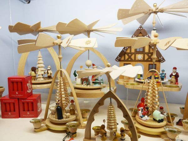「クリスマスピラミッド」も人気シリーズで、ろうそくを灯すと火の力で風が起き、羽根がゆっくりとまわりだします。火気の使えない場所向けに、LEDライトが灯る電動式もあります。