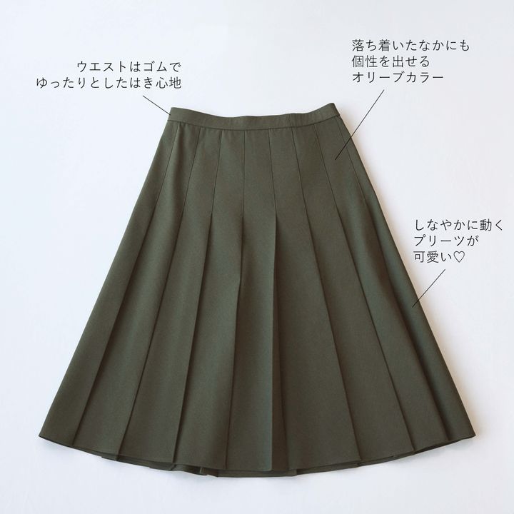 しなやかなストレッチ素材のプリーツスカート。上品なミディ丈で、ブーツ合わせやタイツとコーディネートしてもキマりやすい、すっきりとしたデザイン。腰まわりはプリーツが入っていないため、トップスをインしても着ぶくれせずキレイなシルエットに!
