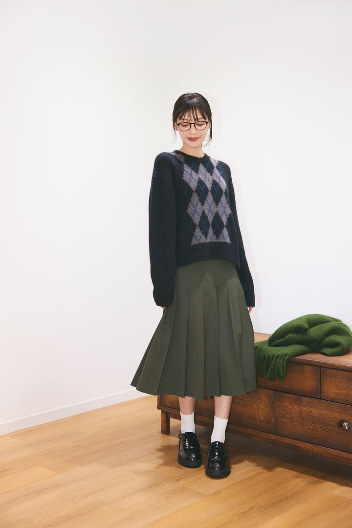 男女問わず定番柄であるアーガイル配色のニットをちょっとフェミニンに楽しむ、プリーツスカートコーデ。動作に合わせてふわりとなびくプリーツが、ほっこりしがちな柄ニットをぐっと軽快に見せてくれる。ニットのショート丈とプリーツの相性も抜群!