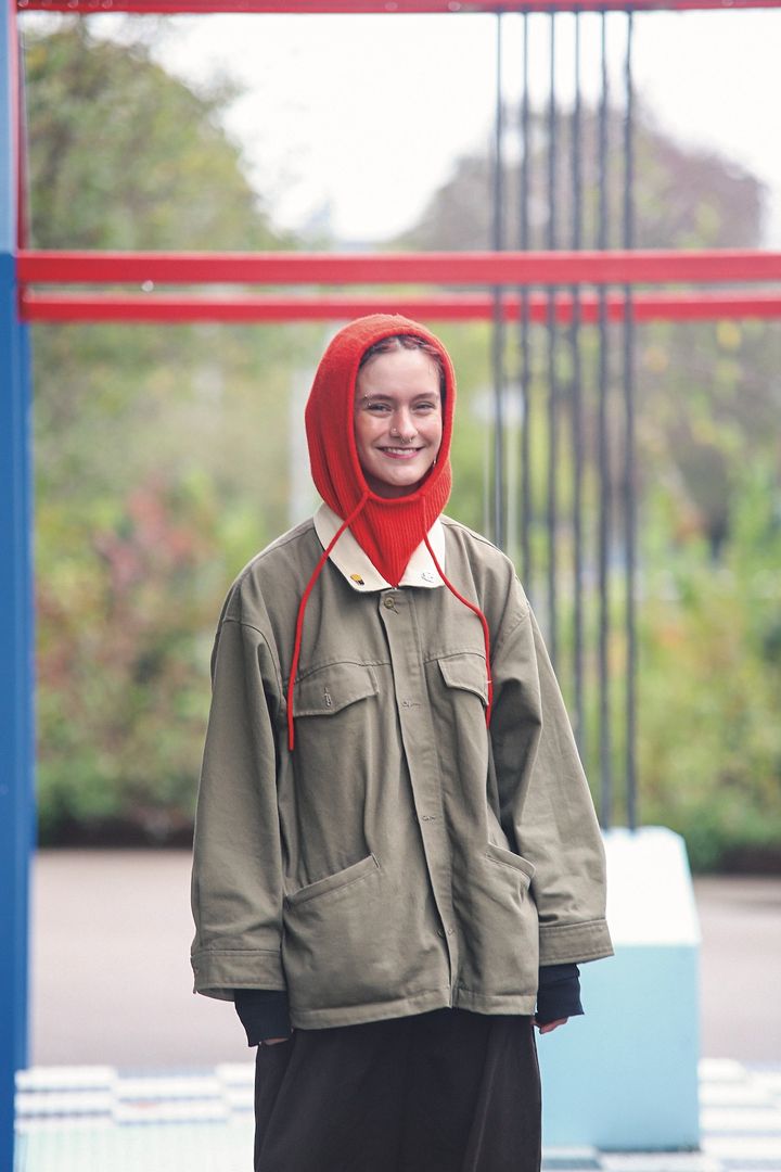 バラクラバをかぶってキュートに防寒することで、ボーイッシュな着こなしに愛嬌が加わる仕組み。挿し色効果も相まって、着こなしのお洒落度がぐんとアップしている!