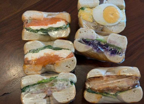 フルーツサンドのほかにも、ベーグルサンドの種類が豊富! サーモン&クリームチーズ、生ハムサラダ、アボカド&えびなど、お食事系も充実しています。