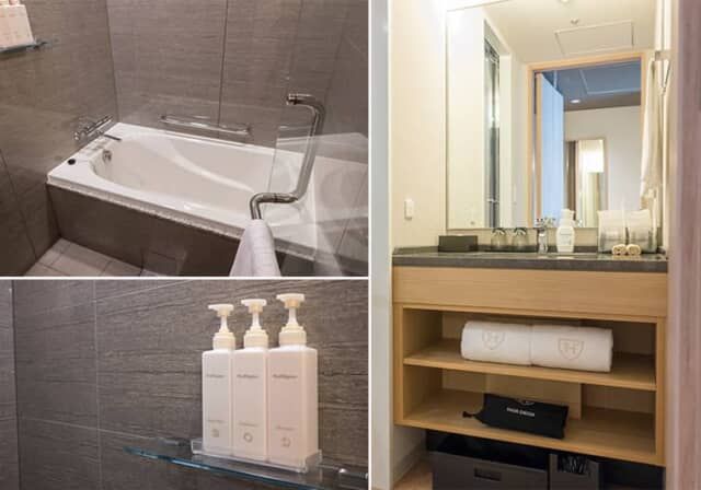 洗面、バスルーム、トイレはセパレートタイプ。バスルームには洗い場がありました。バスアメニティは大浴場と同じくミキモト コスメティックスでそろえています。