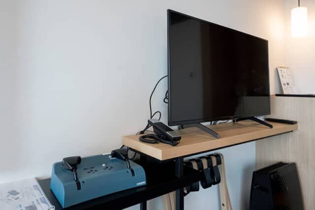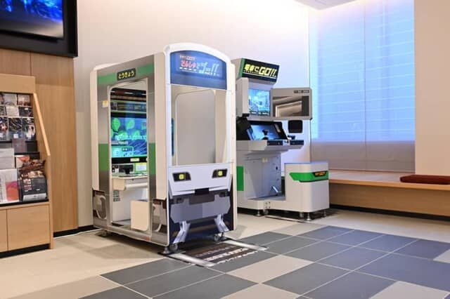 京都鉄道博物館が近いことから、ロビーに置かれた鉄道運転シミュレーションゲームが本格派。手前の「でんしゃでゴー!!」は1回100円。奥の「電車でGO!!」は1区間200円。大人もハマるリアルさです。