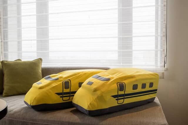 ▲ベッドスローやクッションにも0系やN700系新幹線のデザインがある特別仕様