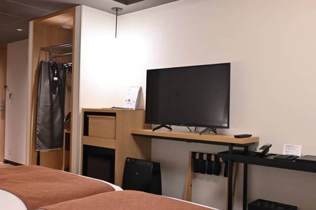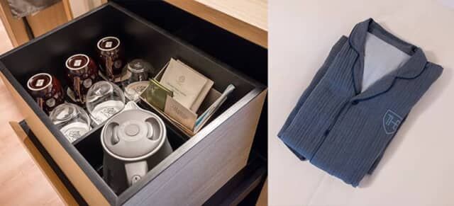 パジャマはガーゼタイプで着心地もよく、大浴場に行くときにも利用できます。キャビネットの引き出しには茶箱をイメージした木箱が入っていて、電気ケトルやコップ、マグカップ、コーヒーなどを収めています。