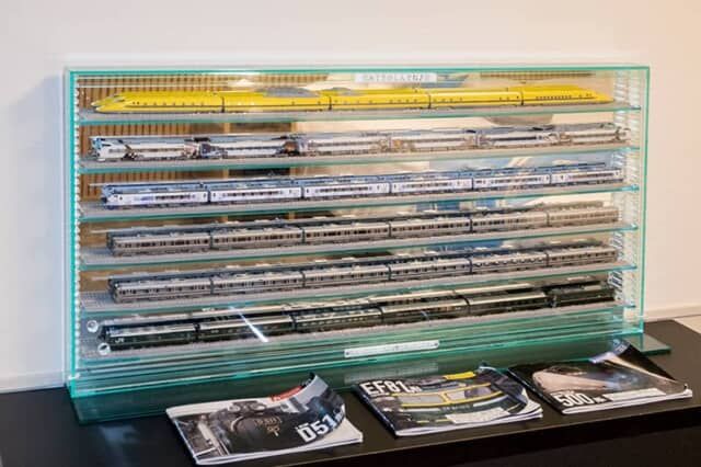 客室によって模型の種類が異なります。取材した客室にはドクターイエローやパンダの顔をした特急「パンダくろしお」の模型などがありました。
