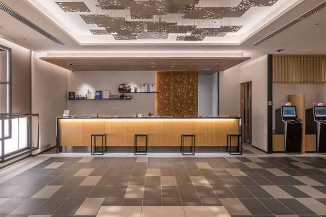 ロビーの壁には梅をモチーフにしたデザインが施され、天井に吊り下げたアルミパネルの開口部から床に光が降り注ぎ、庭の木漏れ日をイメージ。フロント背後の壁には違い棚が設けられるなど、古都ならではの風情に彩られています。1階にはファミリーマートもあって、ロビーから直接入店できるので便利です。