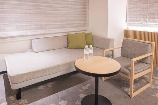 3名で泊る場合はソファーベットとして利用します。作業用のデスクがないので、パソコンなどを使う場合は丸テーブルやソファーを使います。ミネラルウォーターが人数分用意してありました。
