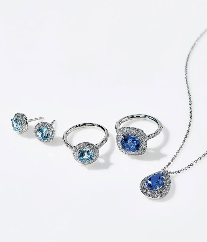<物>ブリリアントカットのダイヤモンドに縁どられた中央の優美なジェムストーン。太陽を思わせる眩い輝きは、前向きに生きる指針となるような存在感。すべて「ティファニー ソレスト」右から・ペンダント〈PT×DIA×タンザナイト〉¥1,760,000リング〈PT×DIA×タンザナイト〉¥2,255,000リング〈PT×DIA×アクアマリン〉¥1,529,000ピアス〈PT×DIA×アクアマリン〉¥1,397,000(すべてティファニー/ティファニー・アンド・カンパニー・ジャパン・インク)