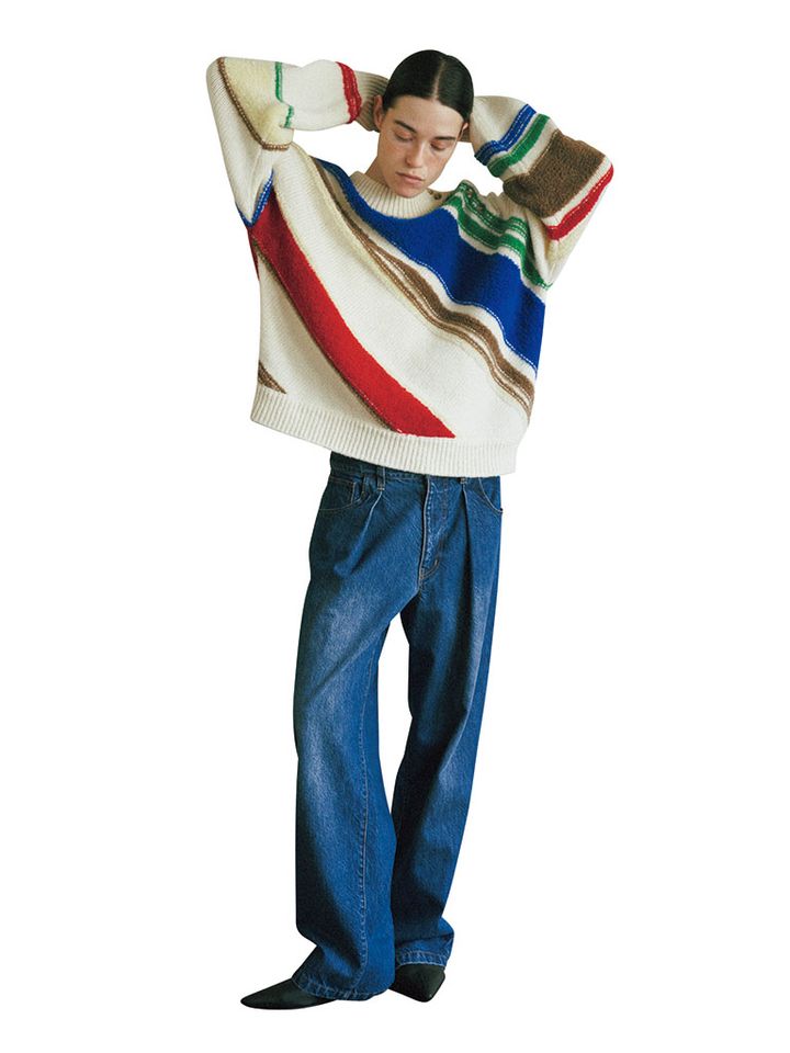 【POINT】インパクトのあるニットは、タック入りのハンサムなデニムと一緒に、浮かれすぎないよう調整。ゆるめのストレートラインでニットの重厚感を縦に流して。