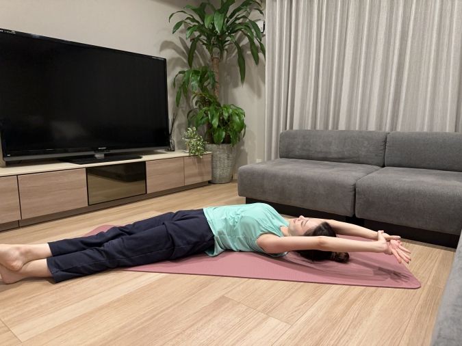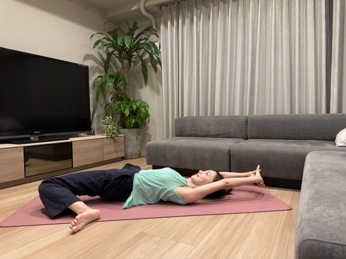 仰向けになり、両脚を肩幅に広げる。両手を頭の上にあげて背伸びをするように手の指を絡める。右手で左手首を掴み、右足の上に左足を乗せて、身体全体がゆるやかな「三日月形」になるように体側を伸ばす。