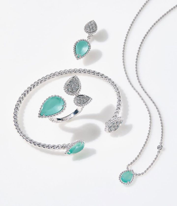 <物>時代とともに進化をとげるメゾンのアイコニックなコレクション。ドロップモチーフは、神秘的なスネークの頭を表現。乳白色で瑞々しいアクアプレーズは’15年に承認された新しい宝石です。すべて「セルパンボエム」右から・ペンダント〈WG×アクアプレーズ×DIA〉¥311,300シングルピアス〈WG×アクアプレーズ×DIA〉¥649,000バングル〈WG×アクアプレーズ×DIA〉¥1,254,000リング〈WG×アクアプレーズ×DIA〉¥1,623,600※すべて予定価格(すべてブシュロン/ブシュロン クライアントサービス)