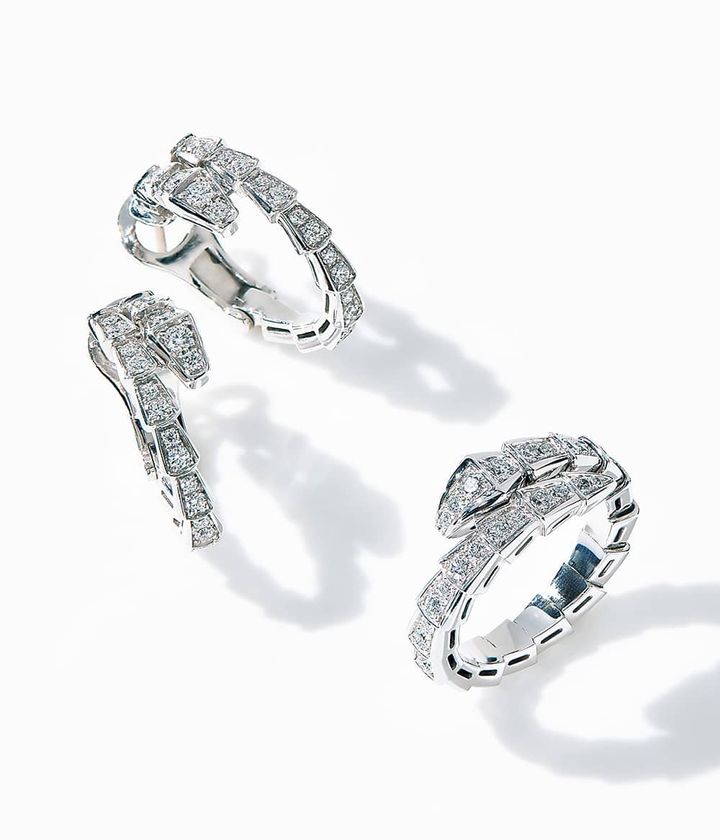 <物>右から・リング「セルペンティ ヴァイパー」〈WG×DIA〉¥1,727,000ピアス「セルペンティ ヴァイパー〈WG×DIA〉¥1,947,000(ともにブルガリ/ブルガリ・ジャパン)