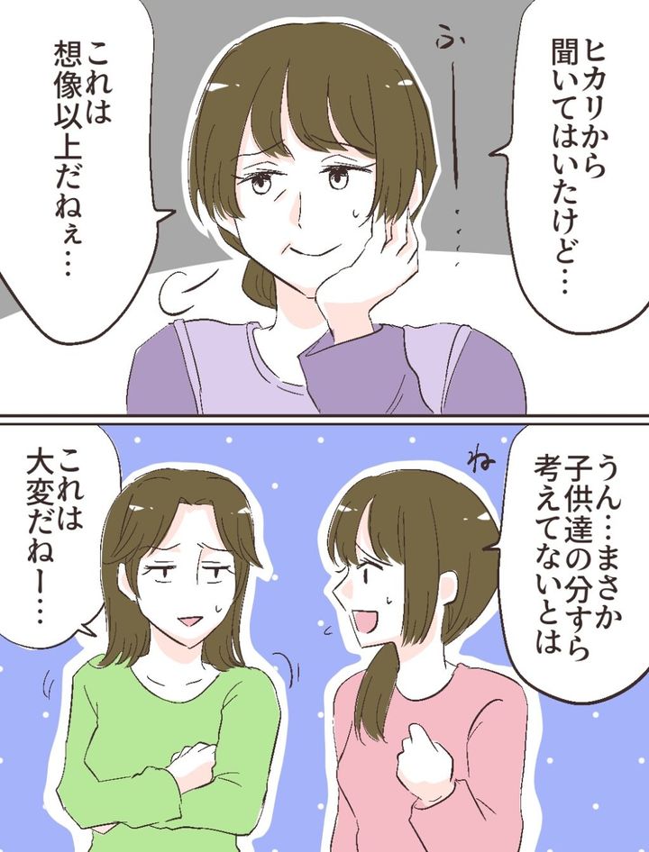 「ヒカリから聞いてはいたけど・・これは想像以上だねぇ・・」と驚きを通り越して呆れ気味の母。「うん・・まさか子ども達の分すら考えてないとは」「これは大変だねー・・」とフトシの食い尽くしにドン引きの姉たち。あぁ・・もう!本当に恥ずかしい!でも、母や姉たちの反応を見て、私の考えがおかしいのではなくやはりフトシがおかしいのだと改めて実感できました。