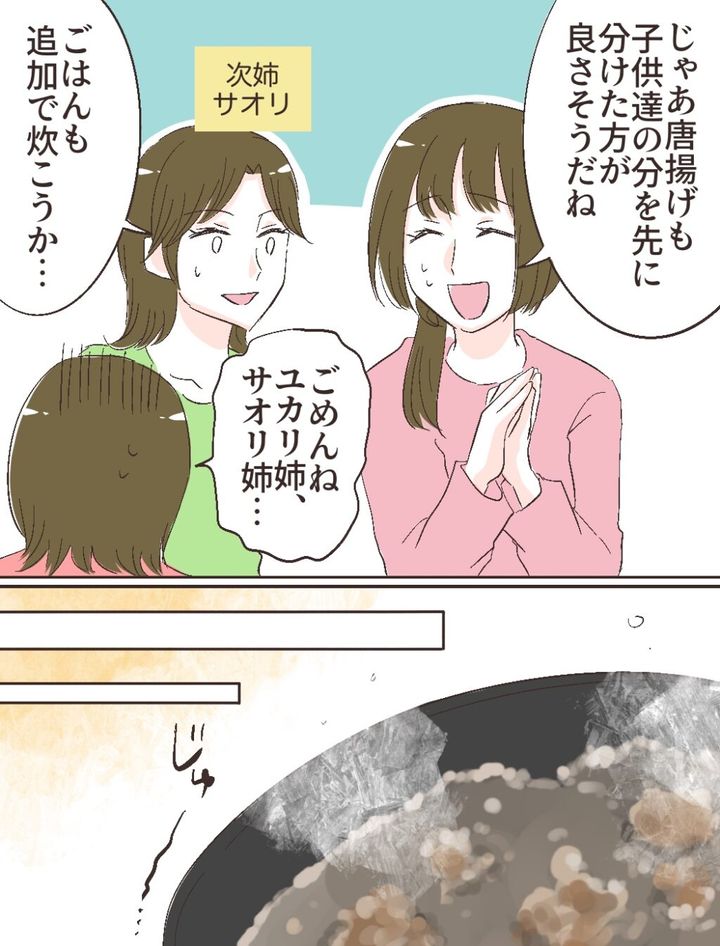 その後、「じゃあ唐揚げも子ども達の分を先に分けた方が良さそうだね」「ごはんも追加で炊こうか・・」と気を使って言ってくれたユカリ姉とサオリ姉に「ごめんね。ユカリ姉、サオリ姉・・」ともう一度謝りながら、私は本当に情けない思いでした。