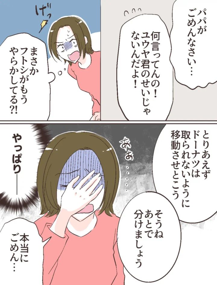 「パパがごめんなさい・・」と謝るユウヤくんを「何言ってんの!ユウヤ君のせいじゃないんだよ!」とお母さんたちが必死にフォローしていたとき、騒がしさに気づいてヒカリさんがやってきました。部屋の中の何とも言えない雰囲気を感じたヒカリさんは「まさかフトシがもうやらかしてる?!」と嫌な予感。「とりあえずドーナツは取られないように移動させとこう」「そうね。あとで分けましょう」と話しているのを聞いて、「あぁ・・やっぱり」とフトシさんのやらかしを察したヒカリさんは「本当にごめん・・」とみんなに謝りました。