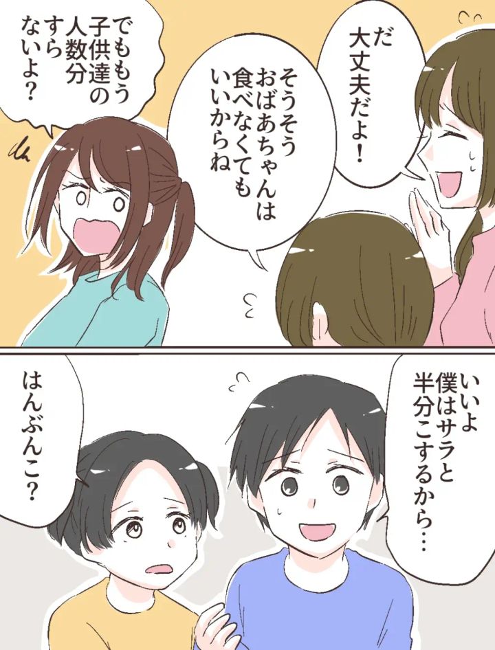 ユカリさんとお母さんが「だ、大丈夫だよ!」「そうそう。おばあちゃんは食べなくてもいいからね」と気を使いますが、「でももう子供たちの人数分すらないよ?」と納得のいかない様子のマミちゃん。すると、ユウヤくんが「いいよ。僕はサラと半分こするから・・」と遠慮して言いました。