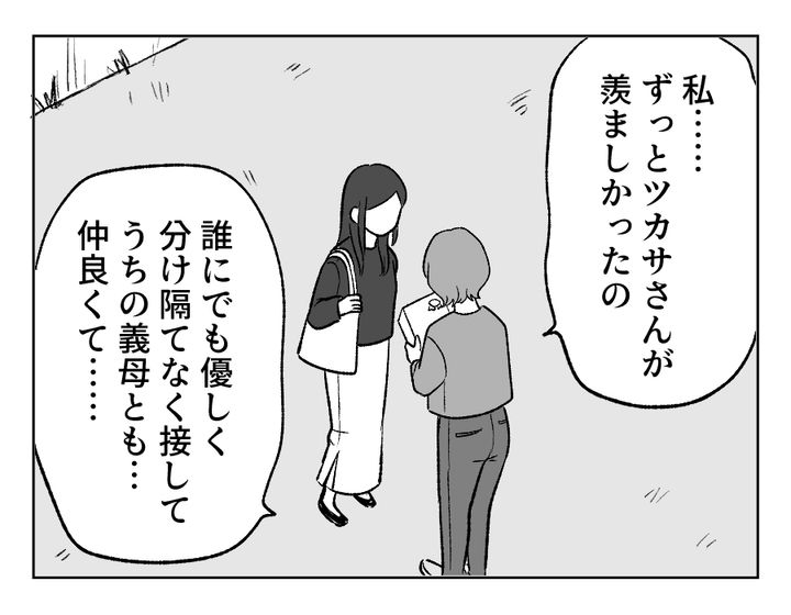 私(チヒロ)は、長男・レオを出産後に退職。しかし夫・マナブの一馬力ではマイホーム資金は貯まらないので、「3年間の期間限定」で義実家で同居をはじめました。しかし義母の口出しがひどく、私は早々に疲れてしまったのです。そんなときツカサさんと出会い、すっかり意気投合。ところがある日、ツカサさんと義母が仲良く談笑している姿を見てしまいます。ツカサさんは表面的には私の味方のような態度を取っておいて、心の中では義母の味方だったのでしょう。しかし幼馴染は私に、ツカサさんの「大人の対応」を見習えと一喝。実際、義母との間に私の悪口は一切なかったと知り、私は自分の幼なさを思い知ったのでした。そんななか、夫の転勤が決まります。引っ越し前日、お別れのプレゼントをくれたツカサさんに、私は申し訳ない気持ちが溢れてしまい……。