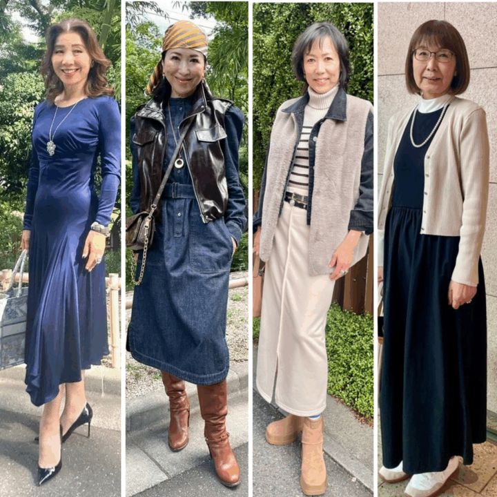 50代・60代の素敵読者4名のワンピース&スカートの着こなしをチェック! そのまま着るのではなく、ベストや小物をプラスした今っぽく、華やかなコーディネートは必見です。