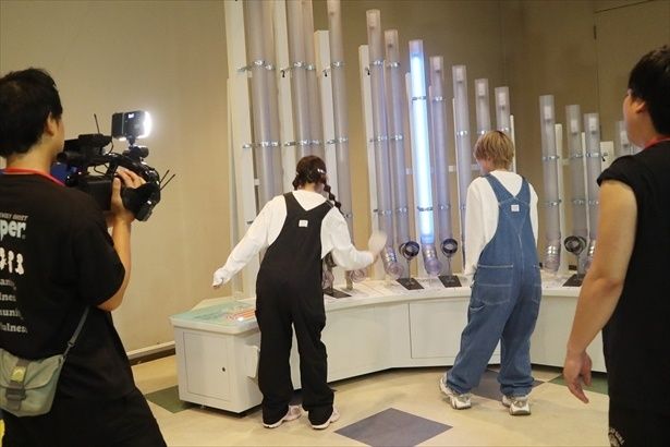 普段はなかなかできない展示の数々に笑ったり苦戦したりの2人。しかし、長さの異なるパイプがずらりと並び、叩くと長さごとに異なる高さの音が出る「メロディパイプ」では、子どもの頃からエレクトーンを習っていた稲垣さんがその腕前を見せる場面も。