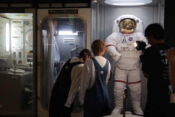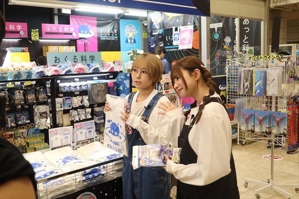 続いて向かったミュージアムショップでは、作中でアイリが着ていた、コスモ星丸のプリントTシャツを富田さんが発見!多彩な科学グッズが並ぶショップでお土産を選んだ2人は、宇宙や深海、ナノテクノロジーなど科学の研究・挑戦が展示されている2階フロアへ。
