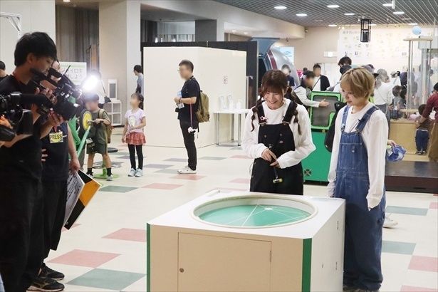 稲垣さんと富田さんは、まず1階のおもしろサイエンスゾーンへ。ここは触ったり動かしたり、体を使って科学のおもしろさを体験できる展示がそろったフロア。2人は「たつまき発生装置」や「ジャイロを体験してみよう」など、好奇心のままに次々と科学体験にトライする。