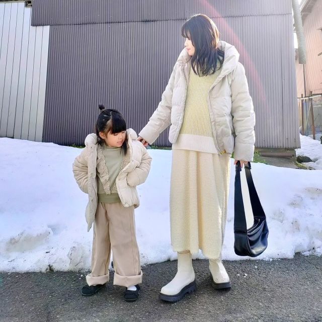 次にご紹介するのは、ベージュやアイボリーで全身をまとめた淡色コーデ。アイテム一つひとつが重くなりがちな12月の服装ですが、こんなカラーリングならダウンジャケットでも軽やかに着こなせますよ。さらにシューズも白系を選ぶことで、足元に抜け感が生まれます。こんな風にあえて冬に明るいカラーを楽しむのもママにおすすめのコーデ術です。