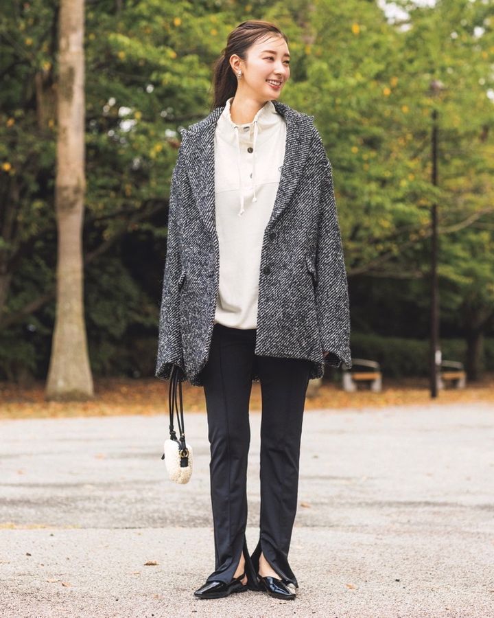 11月23日(日)、スポーティーの代表格であるアノラックパーカーは、そのままだとカジュアルに寄りすぎるから、きれいめ要素が欠かせません。タイムレスなヘリンボーンのジャコットを羽織れば、ぐっと大人のムードに。裾スリット入りのレギンスパンツは、ほんのりフレアで脚長効果も抜群です。歩くたびにちらっと素肌が見えて、重たくなりがちな冬コーデに軽さが生まれます。足元はきれいめパンプスでまとめて、スポーティー×きれいめの上品ミックスを楽しんで。