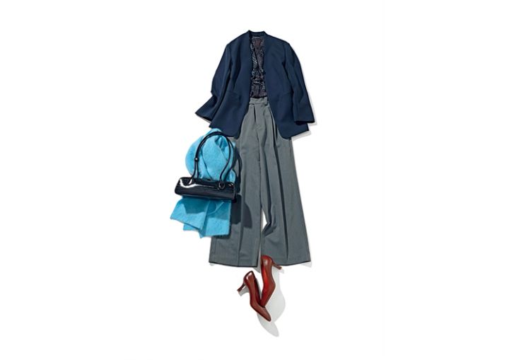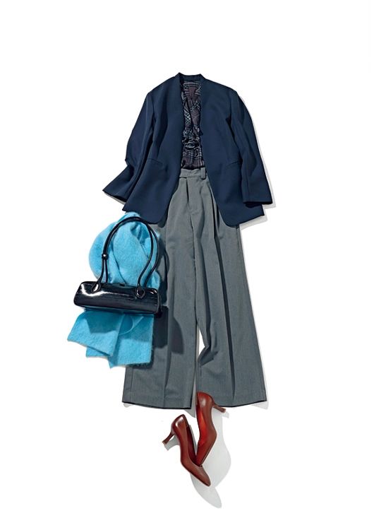 ジャケット¥34,100/ドレスレイブ(ジオン商事) チェックブラウス¥18,700/ジャスグリッティー グレータックパンツ¥12,980/ギャレスト(ワールド) ストール¥35,200/ドレスレイブ(ジオン商事) ブラウンパンプス¥19,250/ダイアナ(ダイアナ 銀座本店)横長バッグ¥17,380/Cepika(ジオン商事)