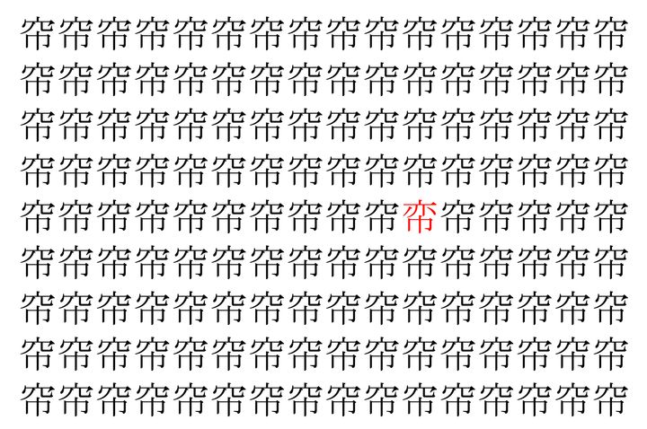 画像の中には、「帘」という漢字が縦に9行、横に16個並んでいます。 全部で144個となりますが・・・、そのうち1つは「異なる漢字」となってますよ!!