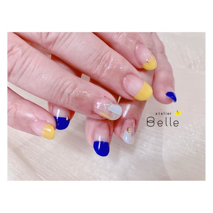 【バイカラーネイル】イエローとブルーのネイルカラーで映える指先に