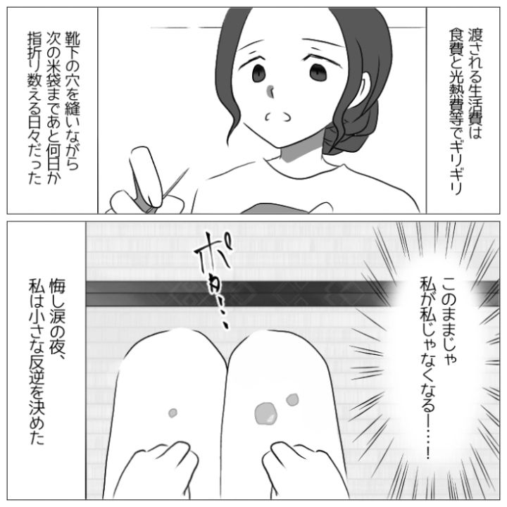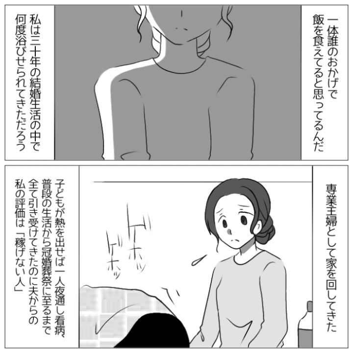 主人公は結婚してから「誰のおかげで飯が食えてると思ってるんだ」という言葉を夫から浴びせ続けられていていよいよ我慢の限界となり・・・。