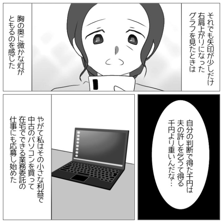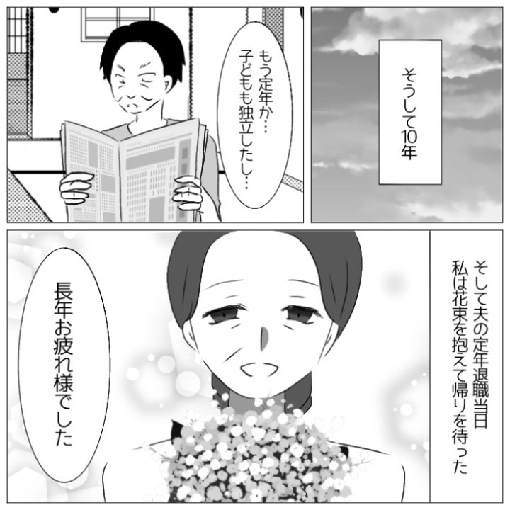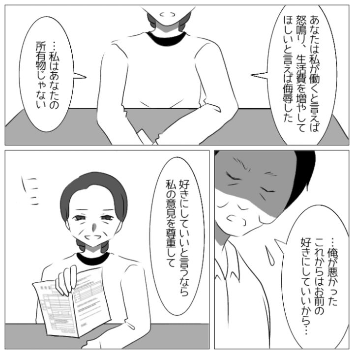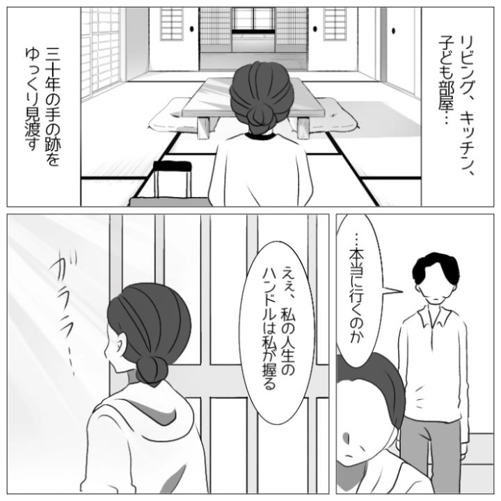 長年我慢し続けた主人公の決意はかたく、まさかの展開に慌てる夫を置いて家を出ていったのでした。