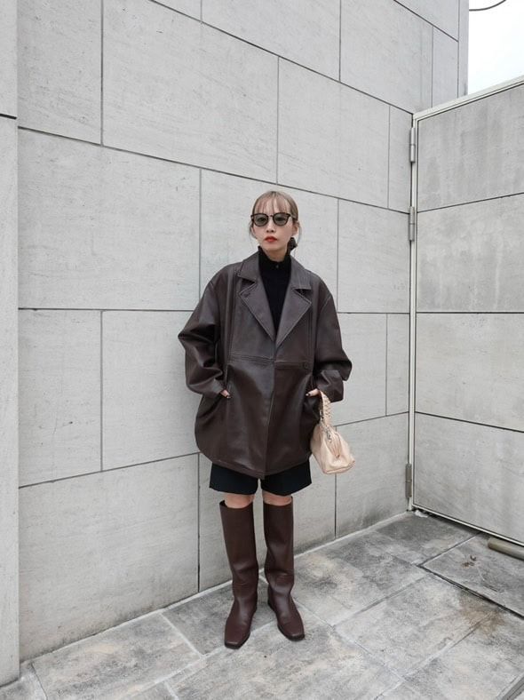 オーバーサイズのレザージャケットがこなれた雰囲気