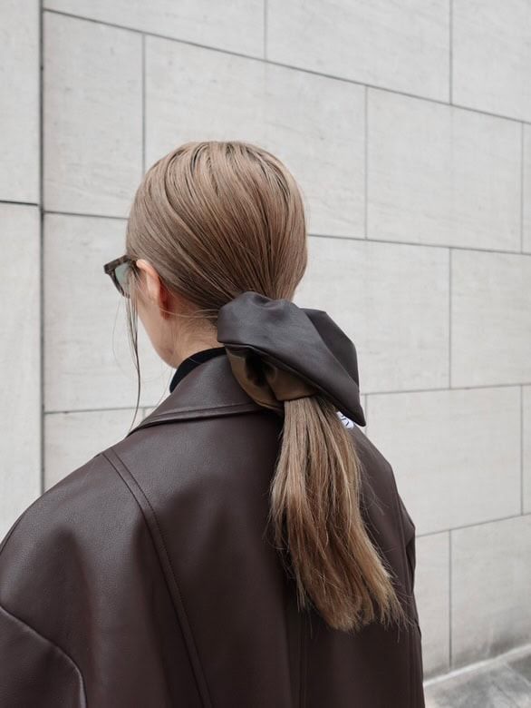 秋らしいブラウンのアイテムをたっぷり使ったスタイリング。ジャケットは少しオーバーサイズ気味だから、ショート丈パンツとも相性抜群! 足元はロングブーツを選び、大人っぽく仕上げています。ボリューミーなシュシュでヘアアレすることで、女性らしさも忘れずに。