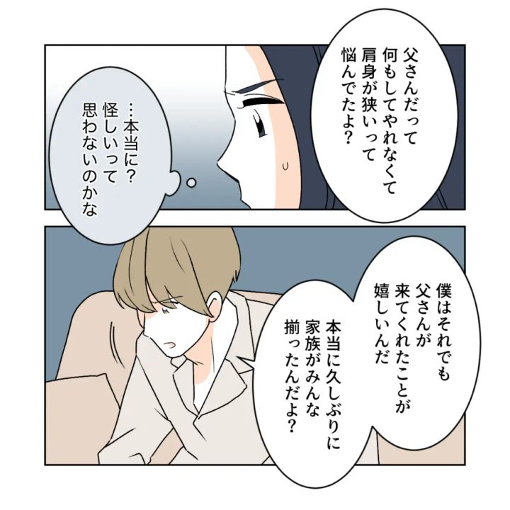 「父さんだって何もしてやれなくて肩身が狭いって悩んでたよ?」ショウタはそう言いますが、これまでの義父の言動を見ていた私はその言葉をどうしても疑ってしまいます。ショウタは続けて、「僕はそれでも父さんが来てくれたことが嬉しいんだ、本当に久しぶりに家族がみんな揃ったんだよ?」と切ない表情で言いました。