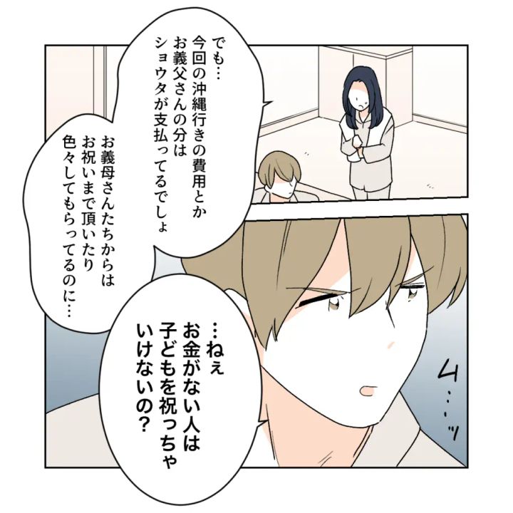 私はショウタに目を覚ましてほしい一心で、義母たちは自費で来てくれたうえにお祝いまで用意してくれたのに、お義父さんの分だけショウタが負担するのはおかしいと思う、と伝えました。ところがショウタはムッとした表情で、「・・・お金がない人は子どもを祝っちゃいけないの?」と返してきました。