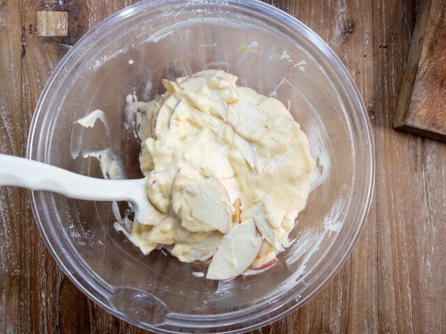 ③ りんごを皮ごといちょう切りにして、②の生地に加え、ざっくり混ぜ合わせます。