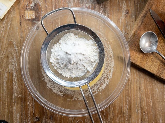 ② 薄力粉・ベーキングパウダーを振るいながら①に加え、こなっぽさがなくなるまで、切るように混ぜ合わせます。