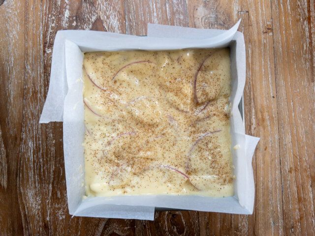 ④ ③の生地を型に流し入れ、表面にシナモンパウダーを振り、予熱が完了したオーブンで、約30分焼成します。※お家のオーブンに合わせて、温度や時間を調節してください。