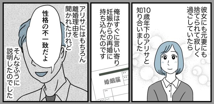 しかし、いざ離婚をしてみると妊娠はまったくの嘘。お金目当てだった彼女はあっさり姿を消してしまいました。俺はなんのために家族もお金も失ったのか……。ひとり寂しく生きていたらアリサと出会ったのです。俺はすぐさま妊娠からの結婚に持ち込んだのでした。