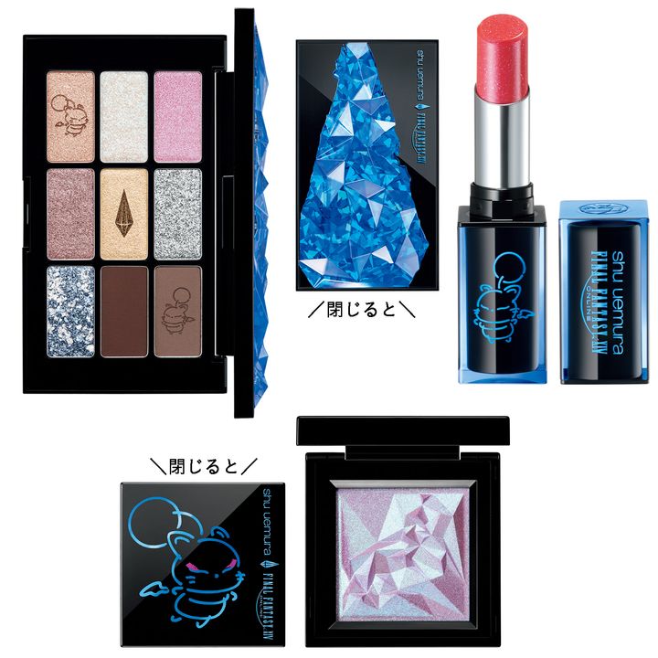 ホログラフィックに輝く「ファイナルファンタジーⅩIV」 とのコラボ。クポ! クリスタル パレット ¥11,000 クラッシュド ジェム クポ! パープル ¥5,720 キヌケアヌード グリーム リミット ブレイク コーラル ¥5,280 ※10月31日発売(シュウ ウエムラ)FINAL FANTASY XIV© SQUARE ENIX