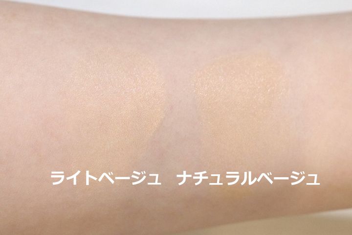 カラー展開は黄みよりの明るめカラー「ライトベージュ」と、ほんのりピンクを含んだ中間的な明るさの「ナチュラルベージュ」の2色。明るめ設計に見えますが、薄膜で透明感がある仕上がりなので幅広い肌色になじむのも魅力です。