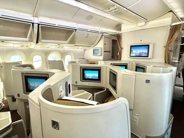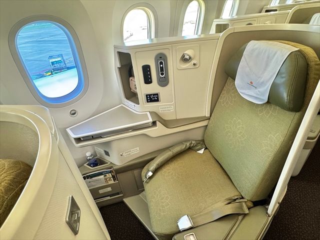 ベトナム航空ビジネスクラスの座席は、窓側から1-2-1席の配列となっており、すべての座席からすぐ通路に出られる設計。着席するとほどよくプライベート感が確保され、ほかの乗客の視線を感じづらいので、自分の世界に入ってリラックスできます。