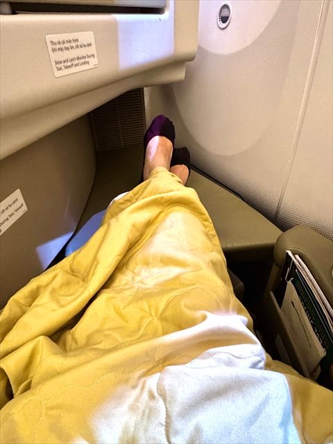 座席に備えられたブランケットは、(写真はつま先が出てますが)肩から掛けても足のつま先まですっぽり覆うことができて冷え知らず。機内では、下半身も冷えるけれど、上半身が寒いということが結構あります。おかげでフライト中は上着を羽織る必要もありませんでした。