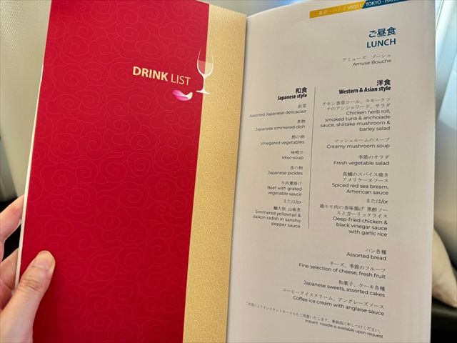 機内で楽しみなのが機内食。ビジネスクラスでは先にメニューが配られ、和食と洋食、ドリンクの希望をCAさんが聞きに来てくれます。