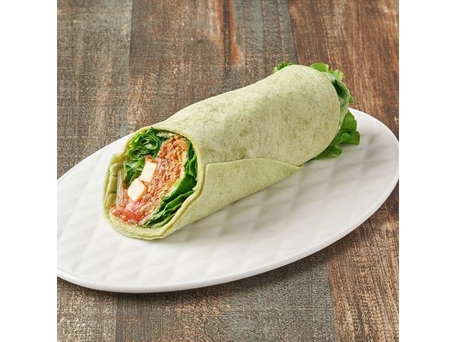 大豆ミート入りのチリソースに、植物生まれのチーズと玄米・葉物野菜などを合わせたサラダラップです。ハラペーニョの辛みがきいたサルサソースをアクセントにしました。 ※静岡県の一部では取り扱いがございません。