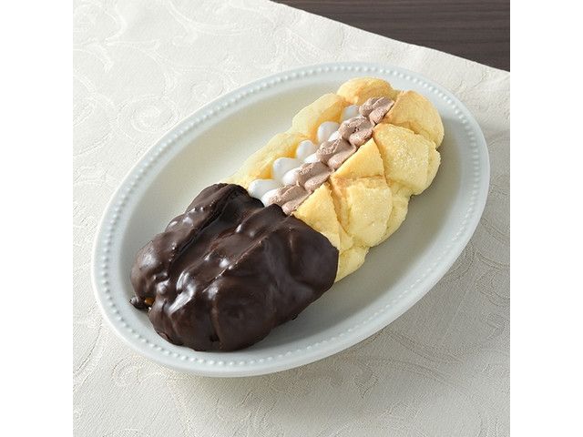 ロールパン形状のメロンパンに、ミルクホイップとチョコホイップをサンドし、チョコをコーティングしました。