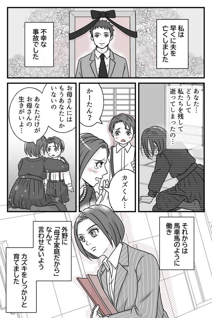 私は夫を早くに亡くし、まだ幼いカズキを抱えてどうやって生きていこうか茫然としていました。しかしずっとそうしているわけにもいきません。カズキは夫の最期の置き土産。立派に育てあげるべく、私は毎日必死に働きました。その甲斐あってか、カズキは母親から見ても優しくてよい子に育ってくれたと思います。それにカズキは成長するとともに、瓜二つと言っても過言ではないほど夫にそっくりになっていきました。それを見て私は、さらにカズキを可愛がったものです。