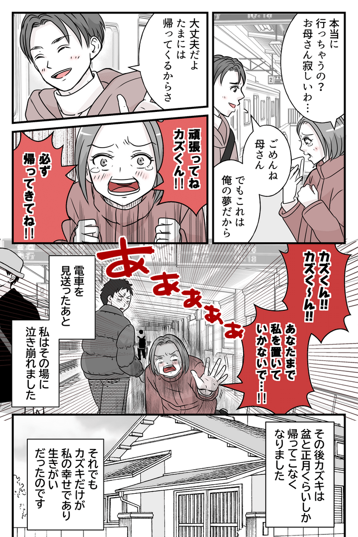それからカズキは亡き夫に瓜二つの姿に成長しました。しかし、その幸せも長くは続きませんでした。大学進学でカズキが遠方へ引っ越すことになったのです。私は駅で泣き崩れ、喪失感に苛まれました。
